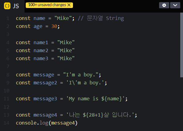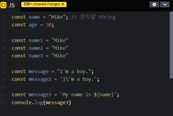 을 사용해야 한다 숫자키 옆에거를 눌러주면 된다. 즉 `My name is ${name}`; 이렇게 해야 한다.