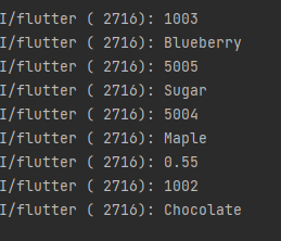 List jsonData = [ { "id": "0001", "type": "donut", "name": "Cake", "ppu": 0.55, "batters": { "batter": [ { "id": "1001", "type": "Regular" }, { "id": "1002", "type": "Chocolate" }, { "id": "1003", "type": "Blueberry" }, //////// 뽑아주세요 { "id": "1004", "type": "Devil's Food" } ] }, "topping": [ { "id": "5001", "type": "None" }, { "id": "5002", "type": "Glazed" }, { "id": "5005", "type": "Sugar" }, //////// 뽑아주세요 { "id": "5007", "type": "Powdered Sugar" }, { "id": "5006", "type": "Chocolate with Sprinkles" }, { "id": "5003", "type": "Chocolate" }, { "id": "5004", "type": "Maple" } ] }, // 0 { "id": "0002", "type": "donut", "name": "Raised", "ppu": 0.55, "batters": { "batter": [ { "id": "1001", "type": "Regular" } ] }, "topping": [ { "id": "5001", "type": "None" }, { "id": "5002", "type": "Glazed" }, { "id": "5005", "type": "Sugar" }, { "id": "5003", "type": "Chocolate" }, { "id": "5004", "type": "Maple" } //////// 뽑아주세요 ] }, // 1 { "id": "0003", "type": "donut", "name": "Old Fashioned", "ppu": 0.55, // 이거 "batters": { "batter": [ { "id": "1001", "type": "Regular" }, { "id": "1002", "type": "Chocolate" } //////// 뽑아주세요 ] }, "topping": [ { "id": "5001", "type": "None" }, { "id": "5002", "type": "Glazed" }, { "id": "5003", "type": "Chocolate" }, { "id": "5004", "type": "Maple" } ] } // 2 ]; // 버튼 정중앙 @override Widget build(BuildContext context) { return MaterialApp( home: SafeArea( child: Scaffold( body: Center( child: ( OutlinedButton( onPressed: () { print(jsonData[0]["batters"]['batter'][2]['id']); print(jsonData[0]["batters"]['batter'][2]['type']); print(jsonData[0]["topping"][2]['id']); print(jsonData[0]["topping"][2]['type']); print(jsonData[1]["topping"][4]['id']); print(jsonData[1]["topping"][4]['type']); print(jsonData[2]['ppu']); print(jsonData[2]["batters"]['batter'][1]['id']); print(jsonData[2]["batters"]['batter'][1]['type']); }, child: Text('button'), ) ) ), ), ), ); } }이런 식으로 해주면 된다. 디바이스에서 버튼을 클릭 했을때