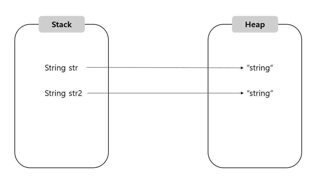 변수는 Stack 영역에 할당 될것이고, new String으로 생성된 문자열값이 Heap영역의 메모리 공간을 할당받아 str이라는 변수가 그 메모리주소를 가르키고 있을것이다. 이를 다른 말로 참조라고도 한다.