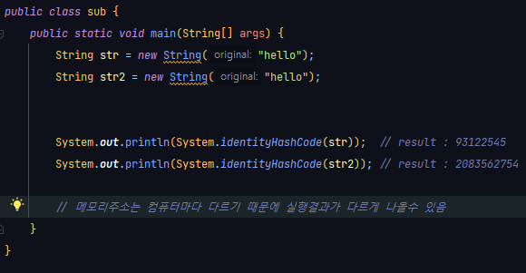 변수를 한개 더 생성해서 똑같이 생긴 문자열값을 new 연산자를 통해 초기화해보았다.